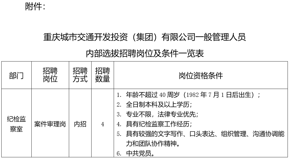 附件:重庆城市交通开发投资(集团)有限公司一般管理人员内部选拔招聘岗位及条件一览表