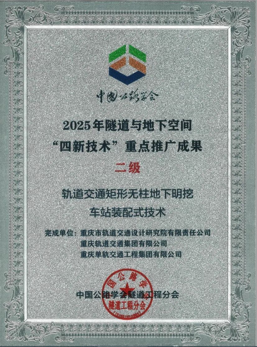 近日,中国公路学会隧道工程分会2025年学术年会在山东青岛顺利召开,由重庆轨道设计院、重庆轨道集团与重庆单轨集团联合研发的“轨道交通矩形无柱地下明挖车站装配式技术”凭借其卓越的创新性和实践成效,在会上成功获评“四新技术”重点推广成果。