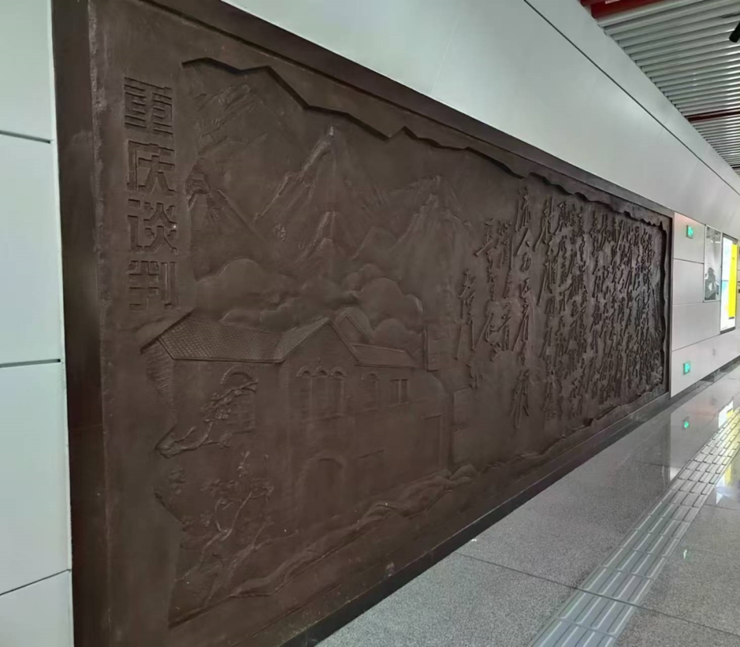 其中,站厅层墙壁上设置着4幅浮雕,分别展示了《红色三岩》《重庆谈判》《雾都明灯》《狱中八条》等内容;站台层24根立柱上雕刻着24位红岩烈士的头像以及介绍。在这里,大家可以感受红岩精神的崇高和伟大。