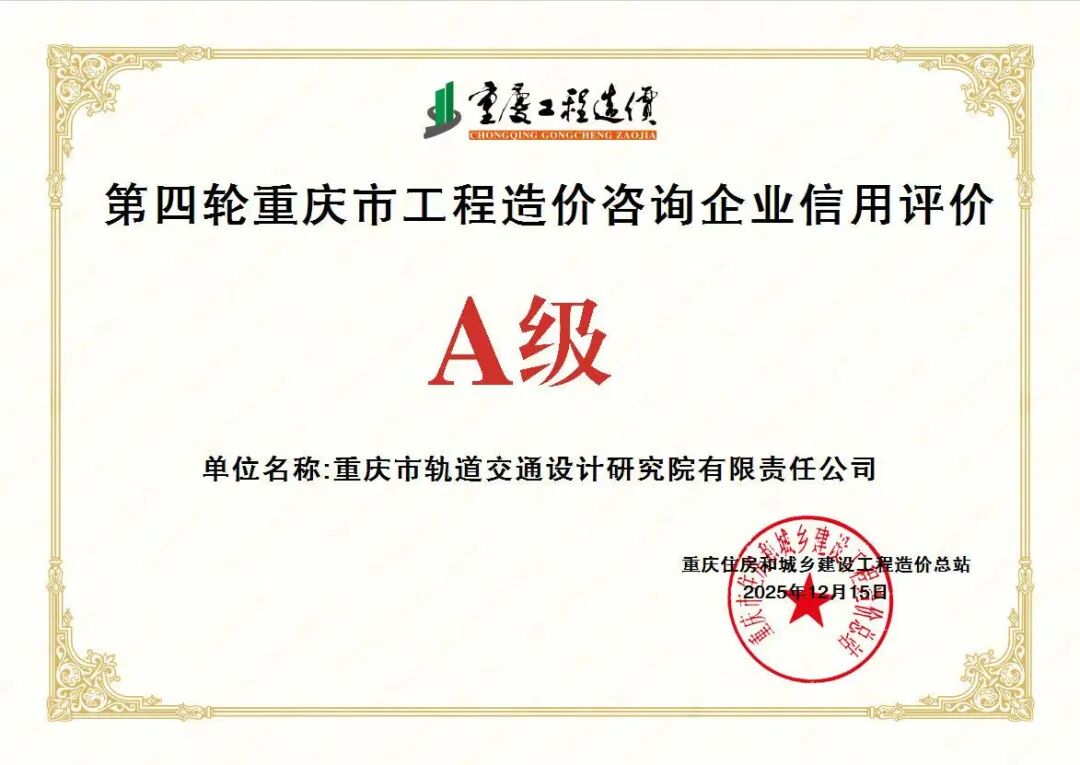 再获殊荣!重庆轨道设计院连续三年荣获重庆市工程造价咨询企业信用评价A级!